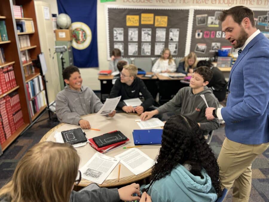 Connor Barnes, center, conducts a butcher class in November 2023 in Lee, New Hampshire, organized by a farmers Alexander Chase and Aly Lopez from Open Hearth Gatherings. (Courtesy of Connor Barnes)