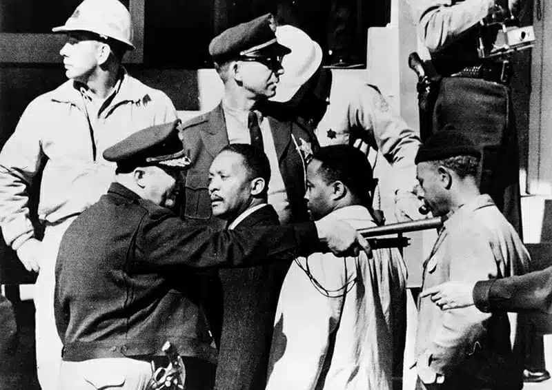 Alabama’s Dallas County sheriff James Clark threatens voting demonstrators with a billy club and electric prod as he orders them to leave the Dallas County Courthouse in Selma on January 19, 1965. (Library of Congress)