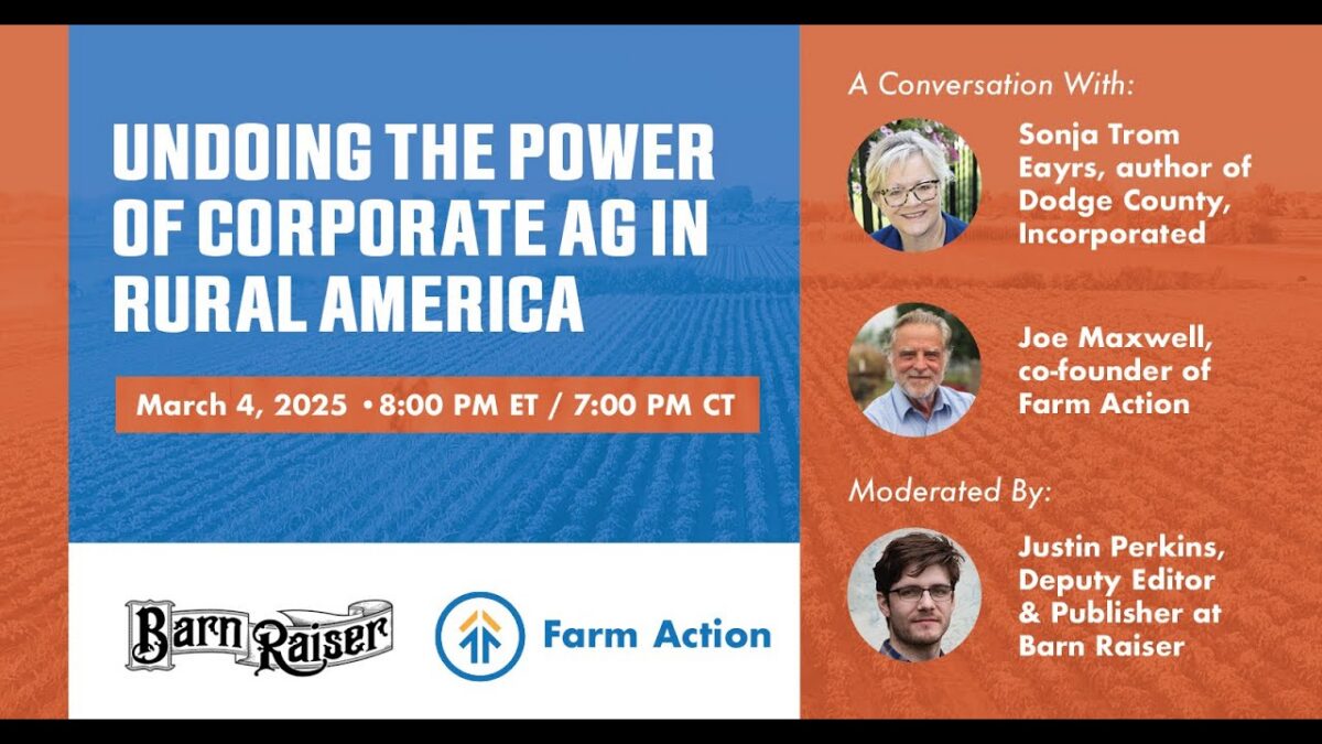 Barn Raiser was joined by Dodge County, Inc. author Sonja Trom Eayrs and Farm Action co-founder Joe Maxwell for a special webinar on how rural communities can organize against the power of Big Ag. Local organizations helping small farmers and confronting Big Ag: Socially Responsible Agriculture Project (SRAP) Iowa Citizens for Community Improvement Driftless Water Defenders Grassroots Organizing Western Wisconsin (GROWW) Missouri Rural Crisis Center Land Stewardship Project Dakota Resource Council Illinois Coalition for Clean Air & Water